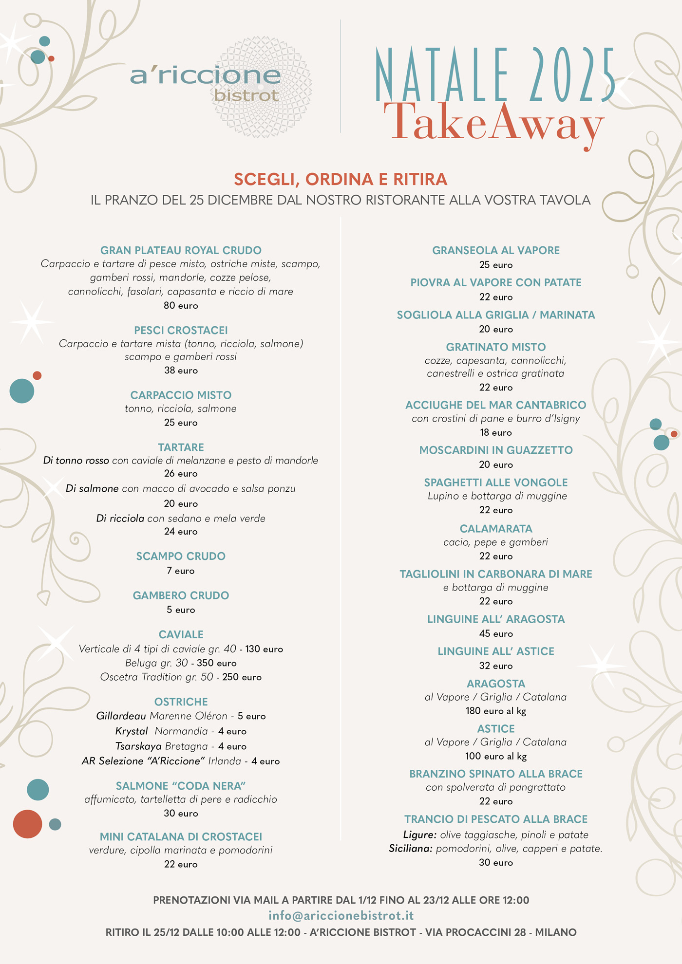 Accanto al banco pescheria, dove ogni giorno trovi il pescato fresco in bella vista, il nostro menù alla carta ti invita a un viaggio nei sapori del mare. Oltre 40 varietà di ostriche, crostacei, caviale da degustare e crudité di pesce, tutto accompagnato da una selezione di vini che valorizzano ogni singolo piatto.